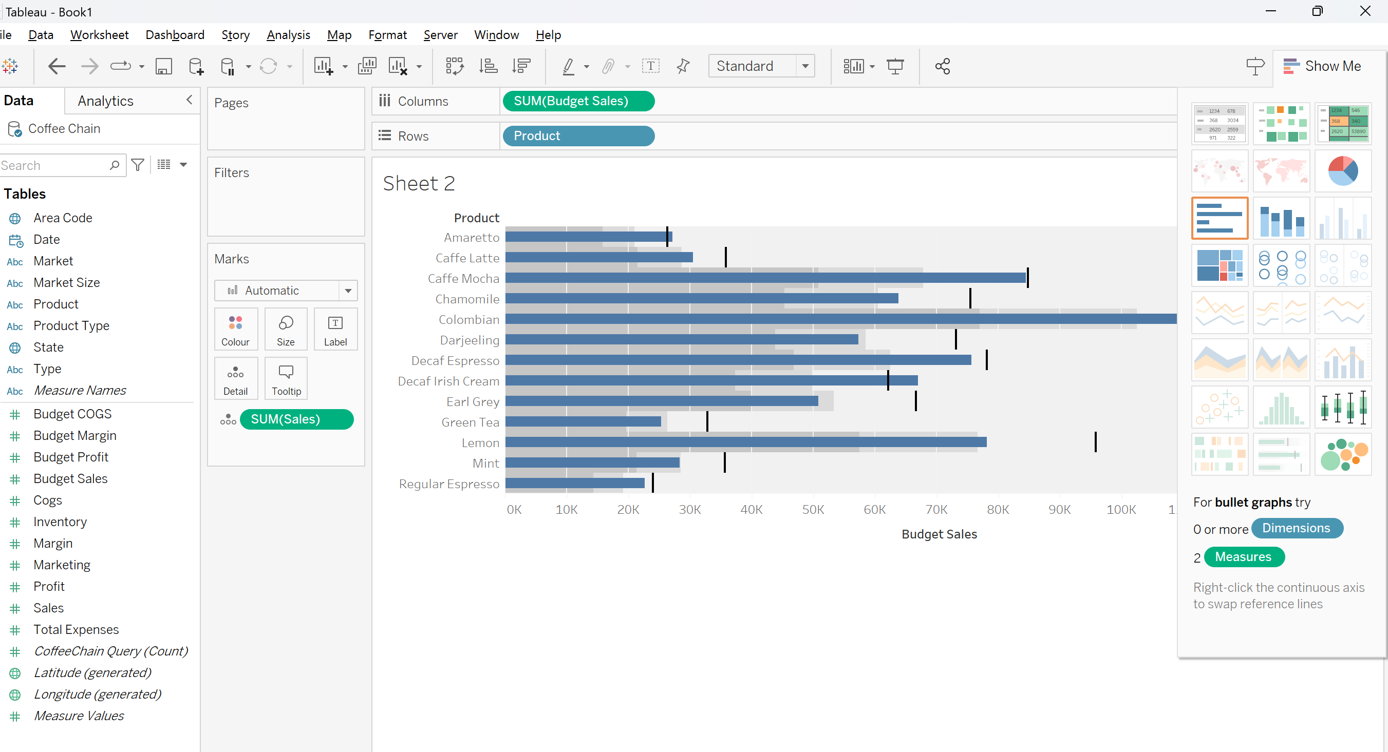 Bullet graph is part of the selection under Show Me.