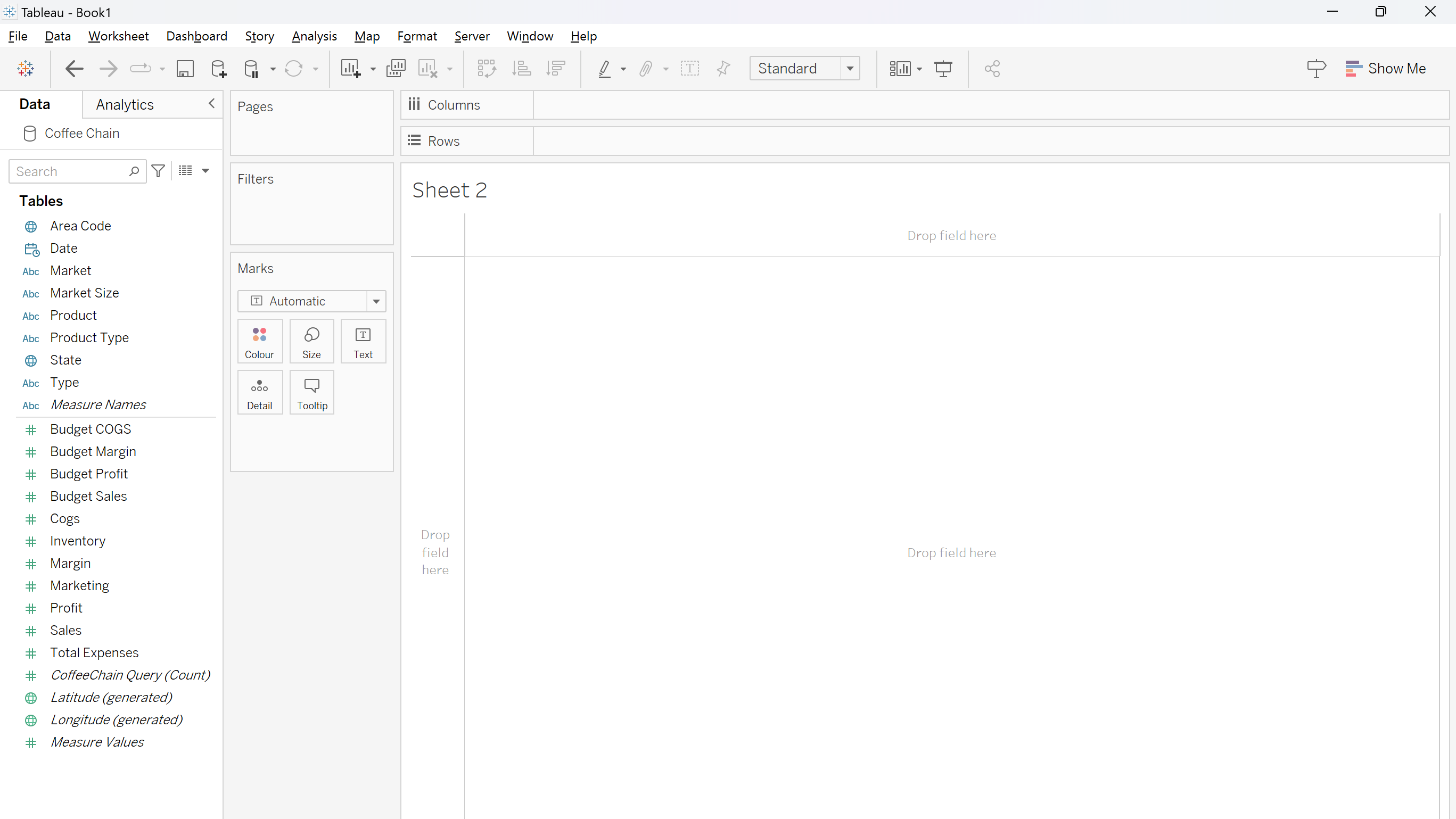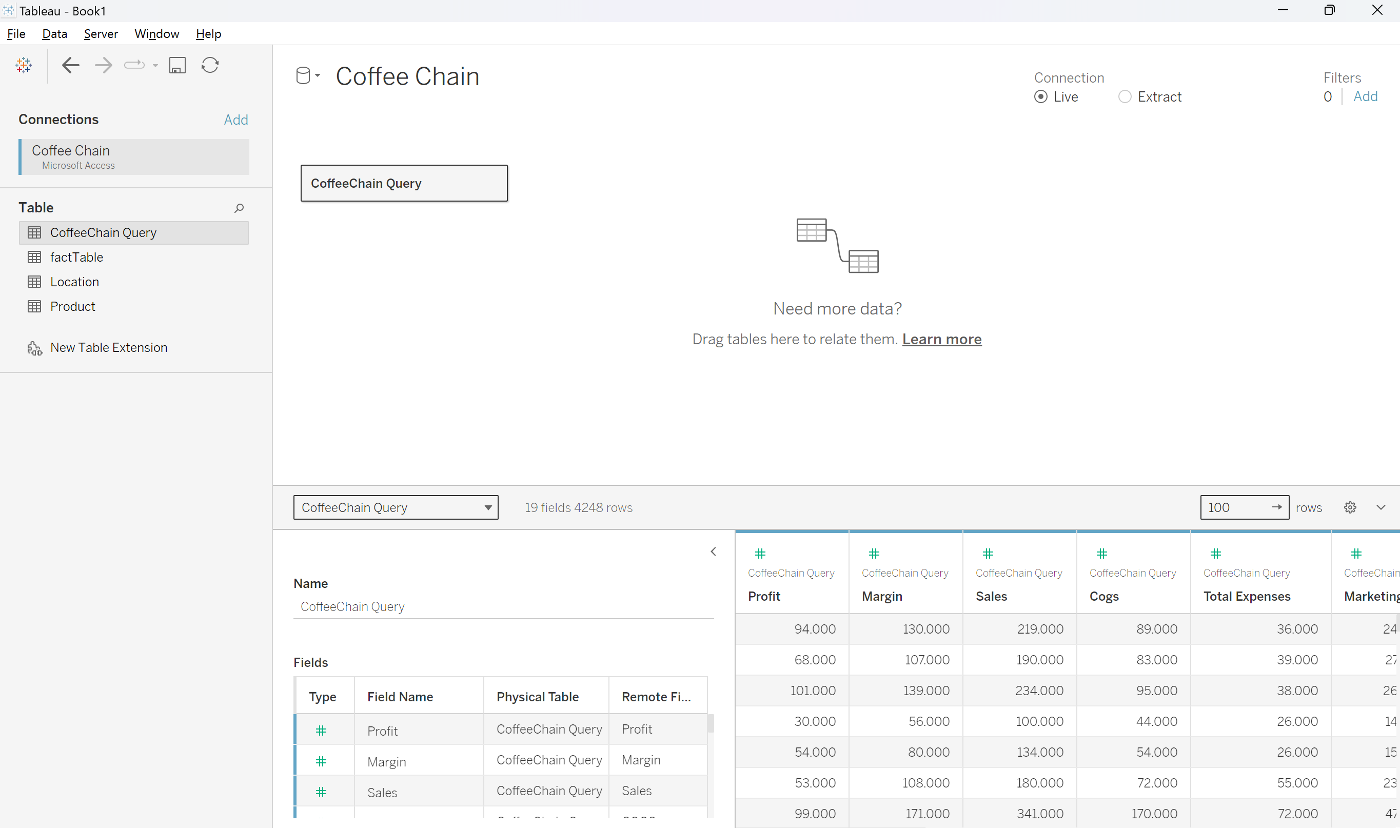 Tableau automatically shows a CoffeeChain Query.