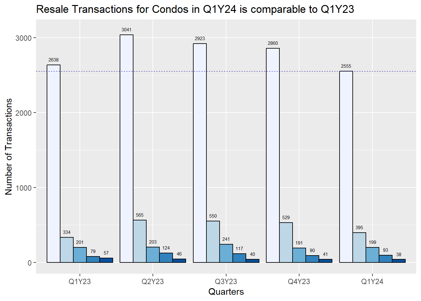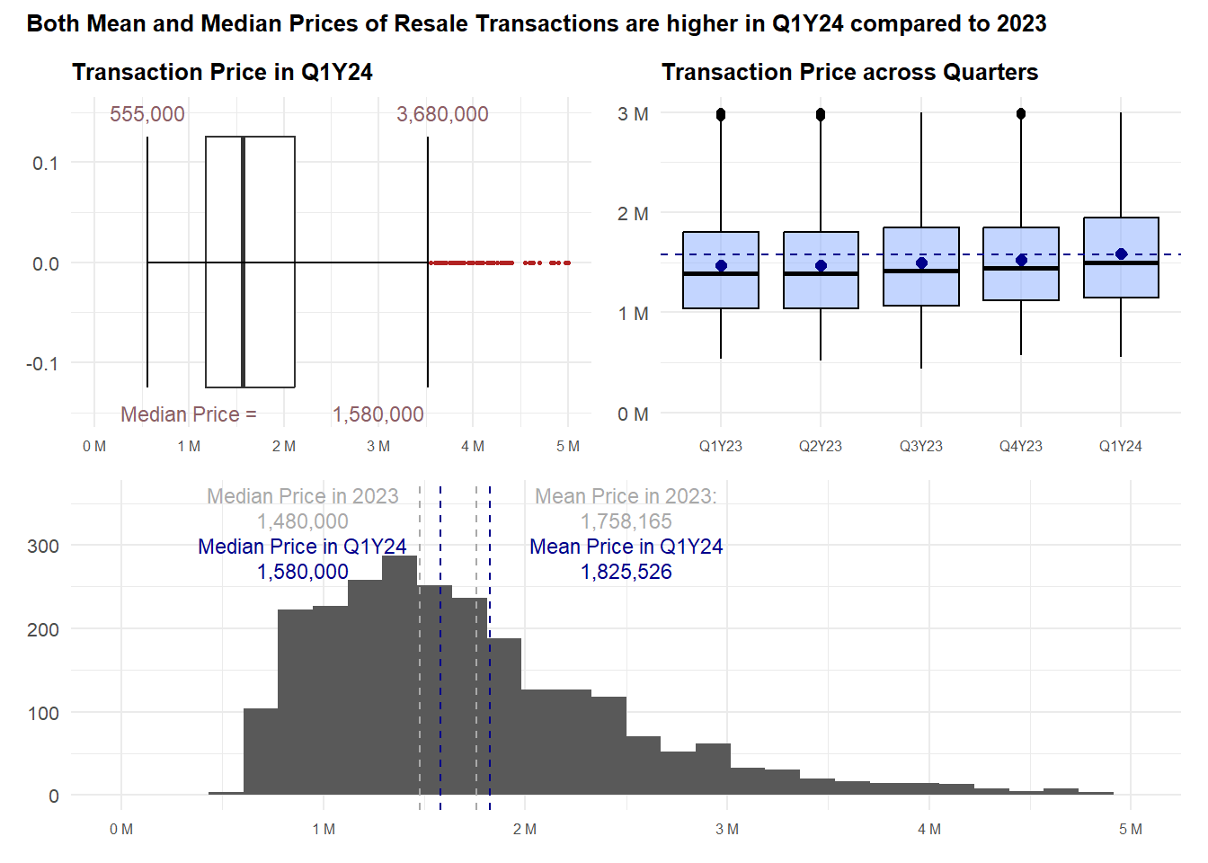 Next we will zoom into Q1Y24 to examine the data and see if there is any trend relating to the number of transactions and prices.