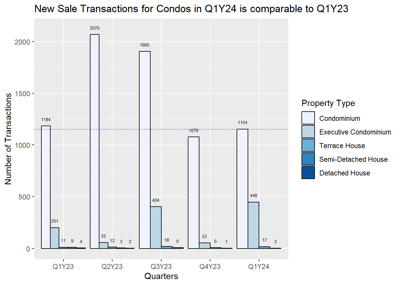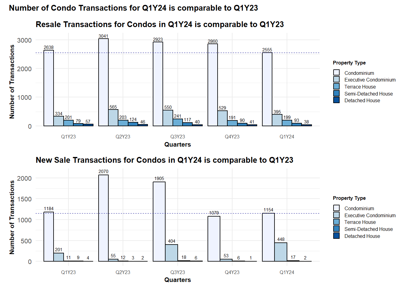 Assuming the role of a graphical editor of a median company, you are requested to prepare minimum two and maximum three data visualisation to reveal the private residential market and sub-markets of Singapore for the 1st quarter of 2024.
