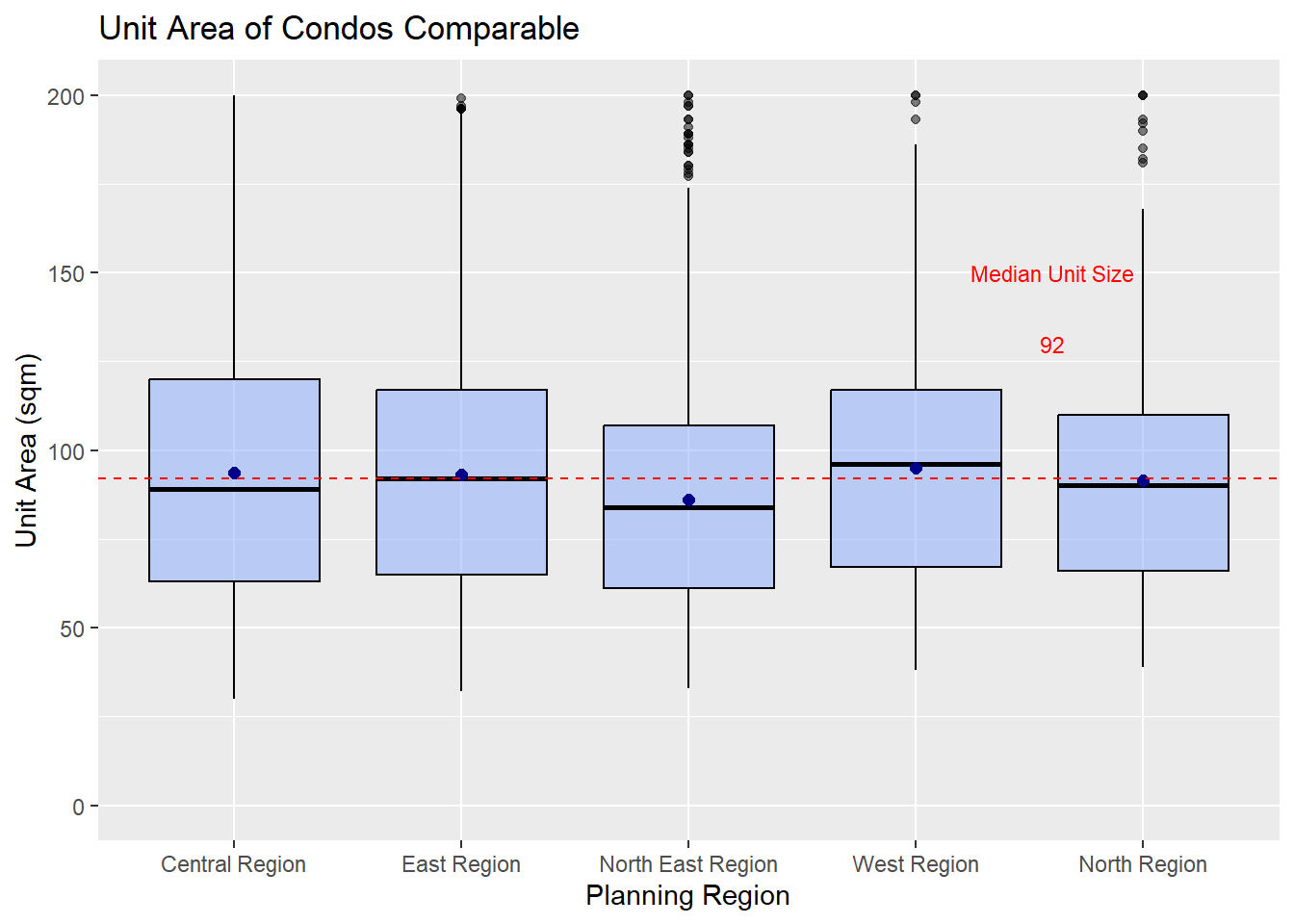 labs(title="Unit Area of Condos Comparable", y = "Unit Area (sqm)", x = "Planning Region")
