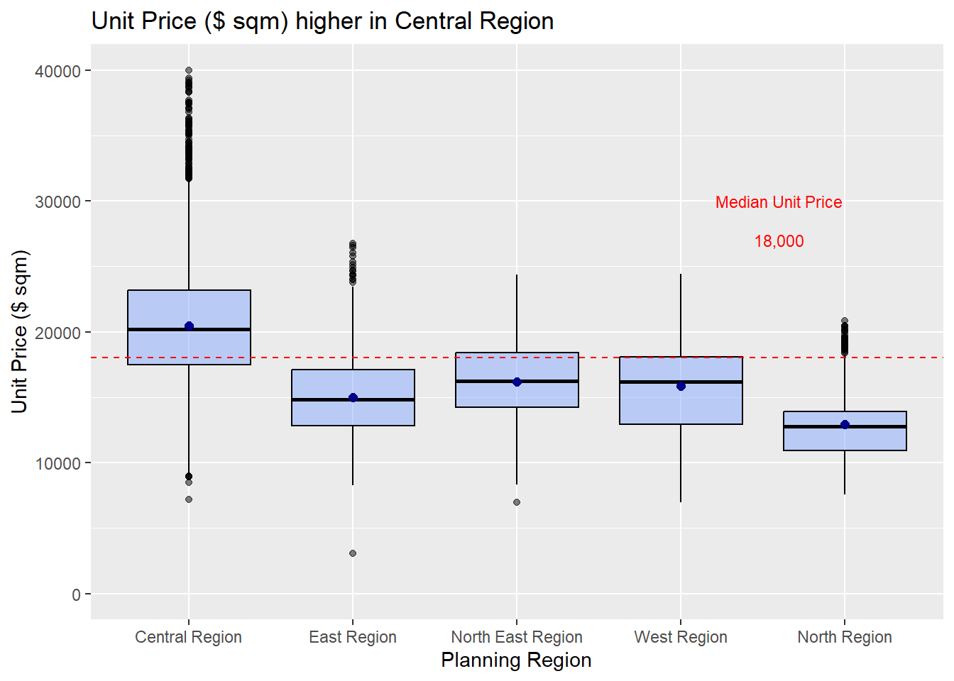 labs(title="Unit Price ($ sqm) higher in Central Region", y = "Unit Price ($ sqm)", x = "Planning Region")