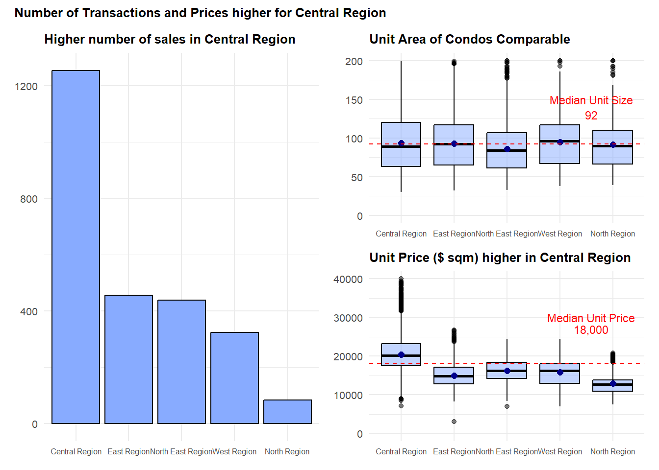 Here we see that the number of transactions for resale condos in the central region is a lot higher compared to the other regions, and the median price in the central region is also higher compared to the overall median price.