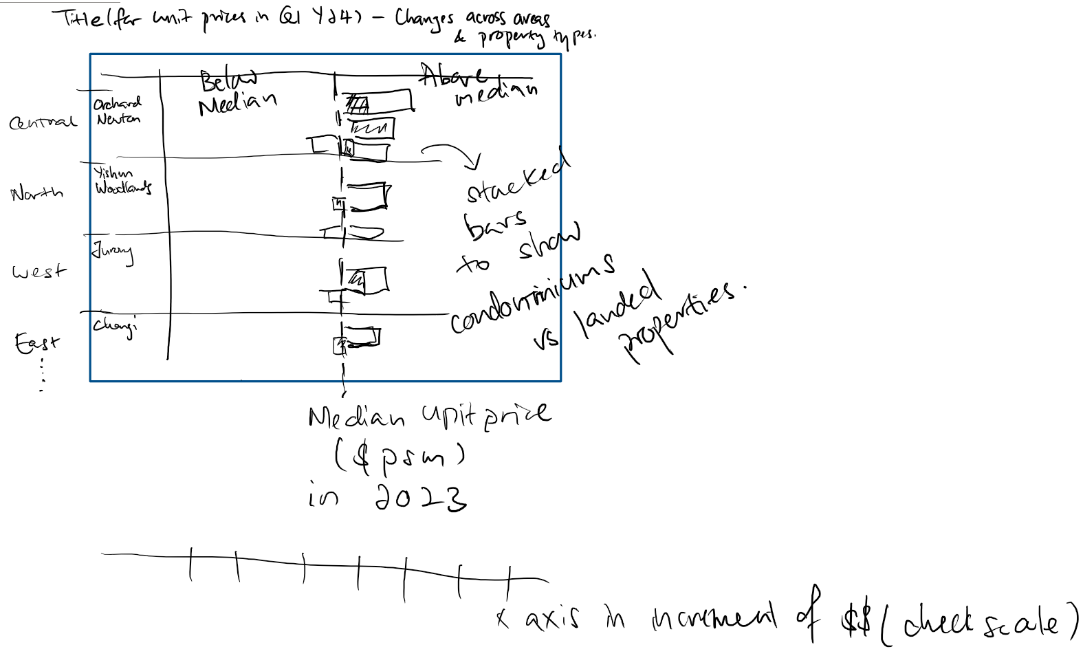 Provided a quick comparison across property types - between Condominiums, Executive Condos and Landed properties. This also showed a key insight - that only the landed properties in Kallang (within Central Region) transacted at below median.
