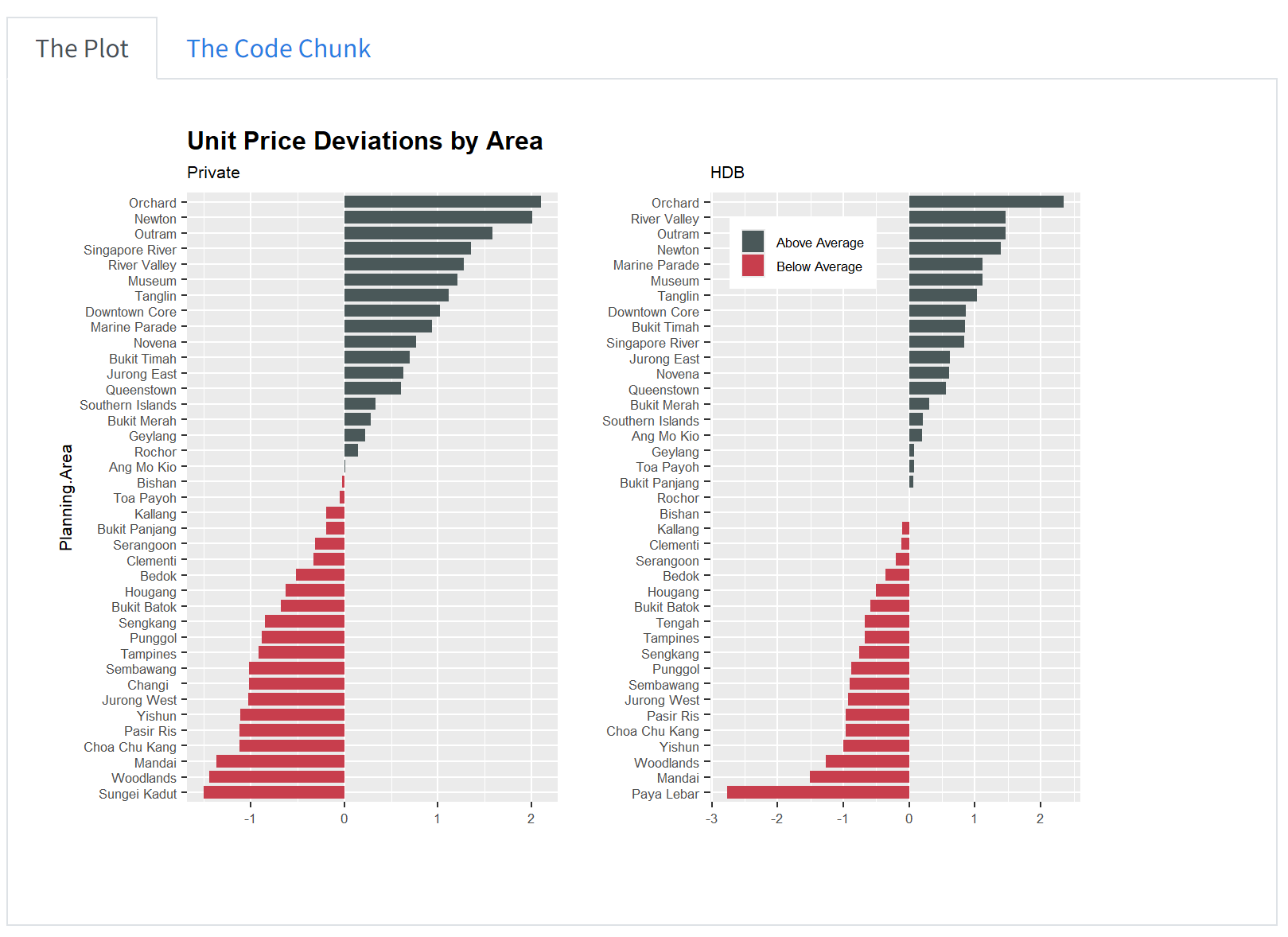 The plot below shows the original design of the unit price deviations by planning areas. We can access the original dashboard from here.