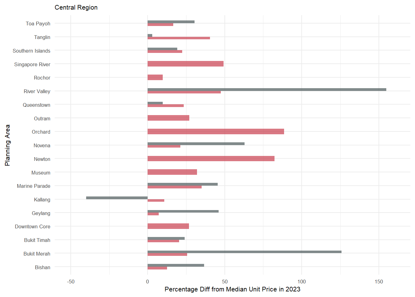 labs(x = "Planning Area", y = "Percentage Diff from Median Unit Price in 2023", subtitle = "Central Region") +