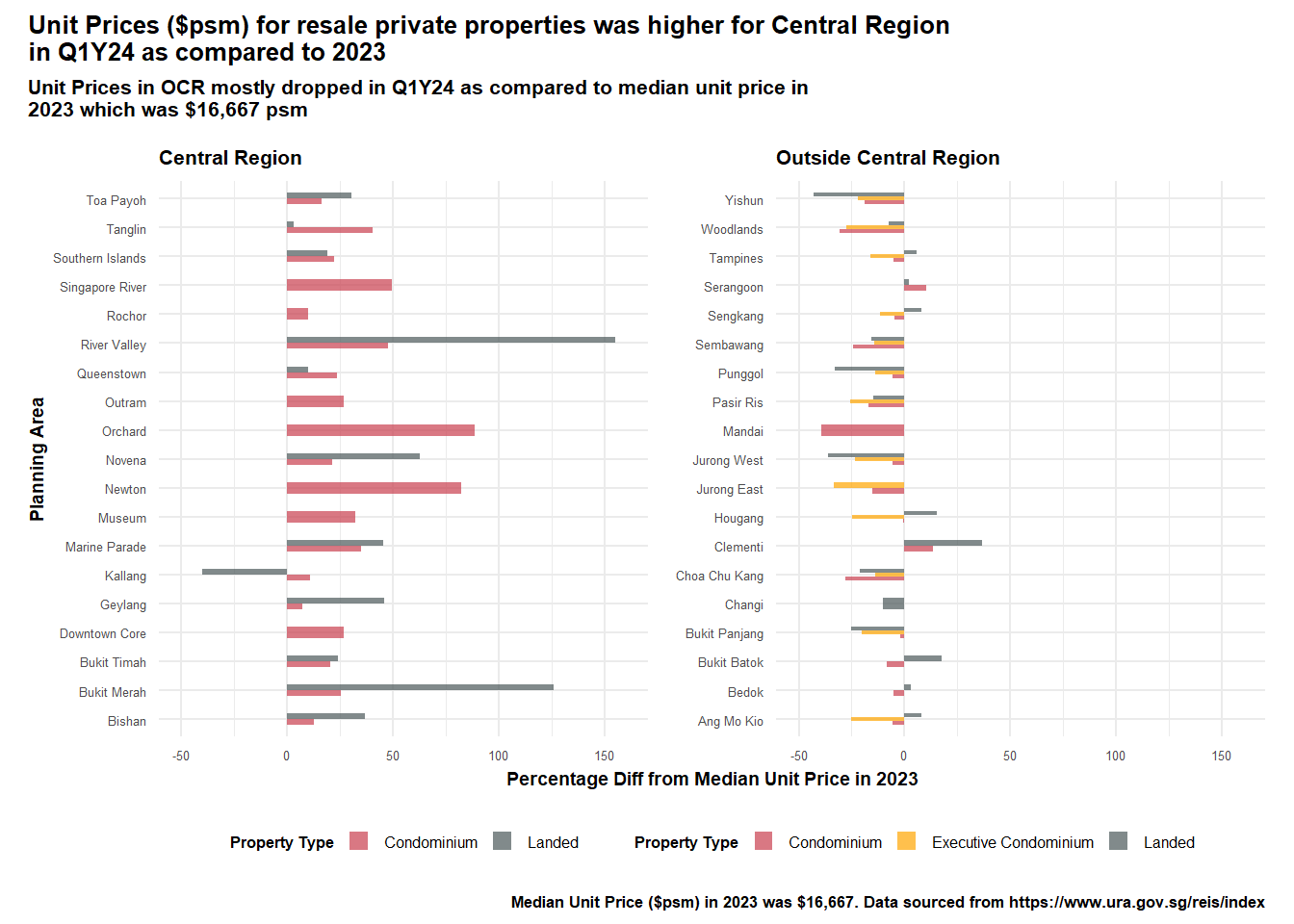subtitle = str_wrap("Unit Prices in OCR mostly dropped in Q1Y24 as compared to median unit price in 2023 which was $16,667 psm"),